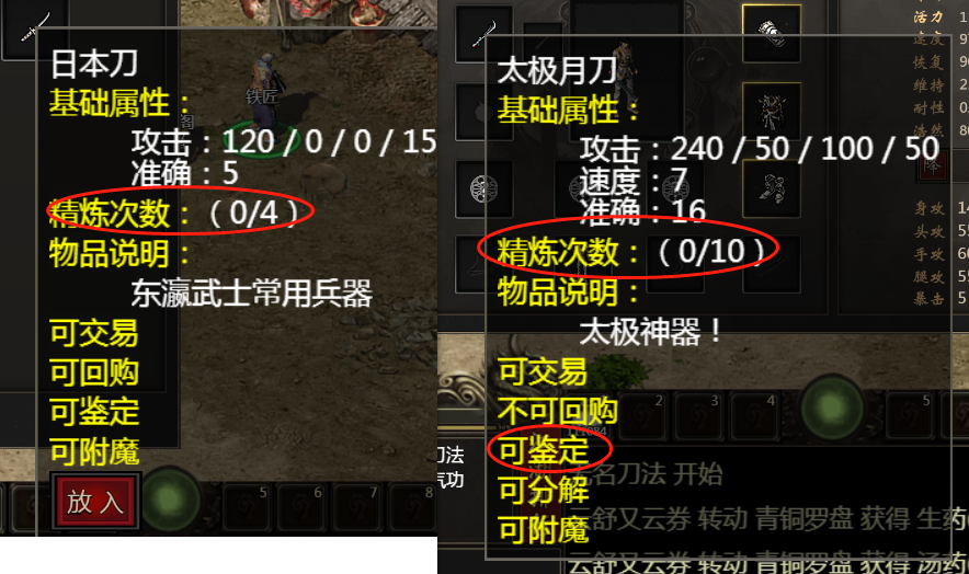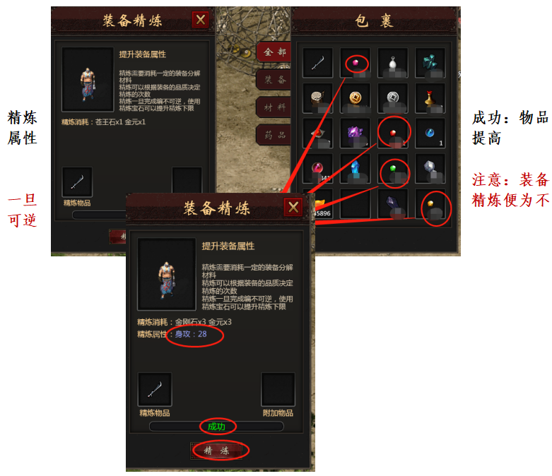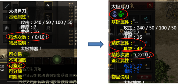 通过装备精炼可以提高装备的属性,根据装备的品质不同,可精炼的次数也不同