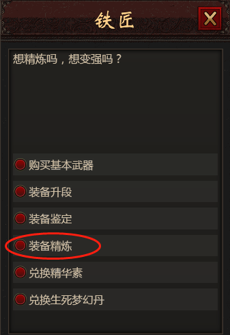 对话铁匠,选择装备精炼,将装备放入精炼物品中,准备好对应的消耗物品,可直接点击精炼,或加入附加物品后再点击精炼