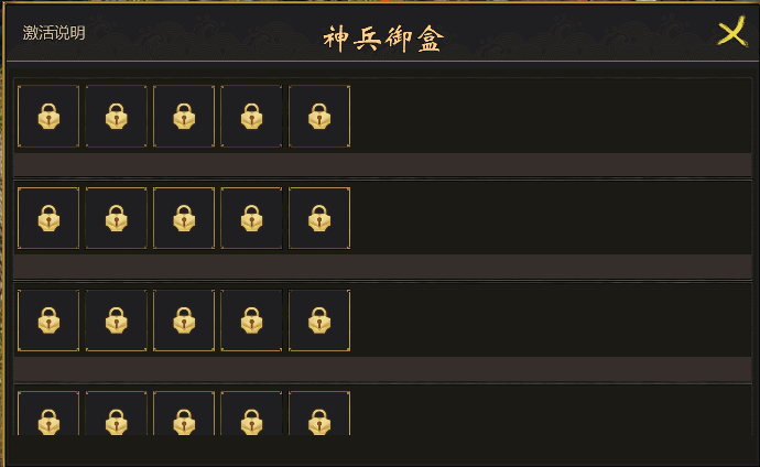 ①玩家只要将护国以上的成套武器或不同指定系列的武器(0~4段均可,弓、投除外)放入神兵御盒,即可额外获得丰厚的属性加成。